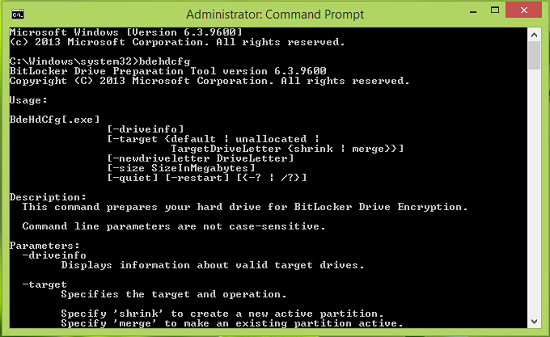 bdehdcfg [–driveinfo <DriveLetter>] [-target {default|unallocated|<DriveLetter> shrink|<DriveLetter> merge}] [–newdriveletter] [–size <SizeinMB>] [-quiet] The in a higher place-mentioned command is in general form and its variable parameters can be altered using the following descriptors: